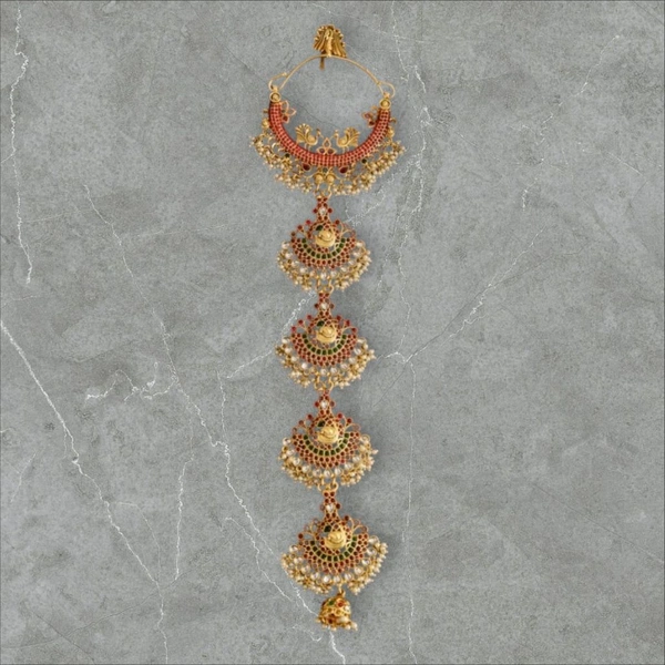 A Traditional Bridal Jada Billa also known as Jadai Billai or Jada Choti is a traditional South Indian hair ornament specifically designed for brides. This ornament is typically worn at the back of the head, attached to the bride's hair braid or bun, and it holds the hair securely in place while adding a touch of elegance and cultural significance.